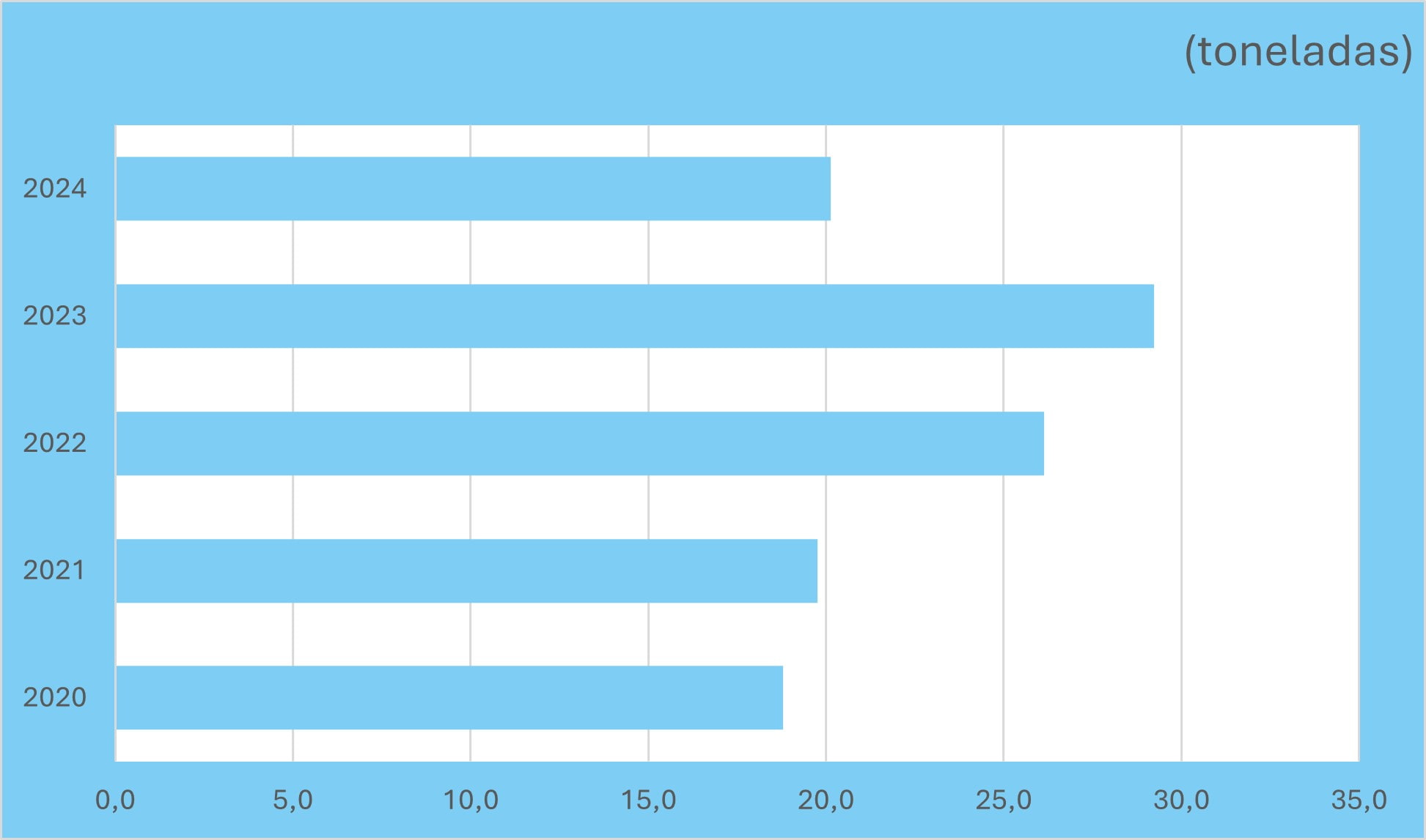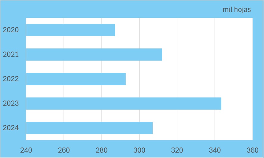 Nos esforzamos por promover el consumo consciente de papel en nuestras actividades administrativas. Aunque el gráfico muestra variaciones a lo largo de los años, seguimos comprometidos con la reducción del uso de papel mediante iniciativas estructurales, como la digitalización de textos y documentos, la realización de reuniones sin material impreso, el fomento de la impresión a doble cara y en tamaño reducido. Además, con la ampliación del uso de herramientas de intercambio en línea y la implementación de la firma digital, reforzamos nuestro compromiso de reducir gradualmente la dependencia de hojas impresas.