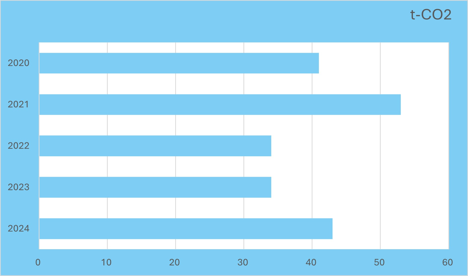 En Kumon América del Sur, la principal fuente de emisión de gases de efecto invernadero está relacionada con el consumo de energía eléctrica en nuestras oficinas. A partir de este consumo, calculamos el volumen de emisiones de dióxido de carbono (t-CO₂). Se observa que, después de un pico en 2021, hubo una reducción significativa en 2022 y 2023, seguida de un ligero aumento en 2024. Esta variación refleja directamente el nivel de utilización de la energía eléctrica, siendo que en 2020 las emisiones fueron menores debido al reducido uso de electricidad en las oficinas.